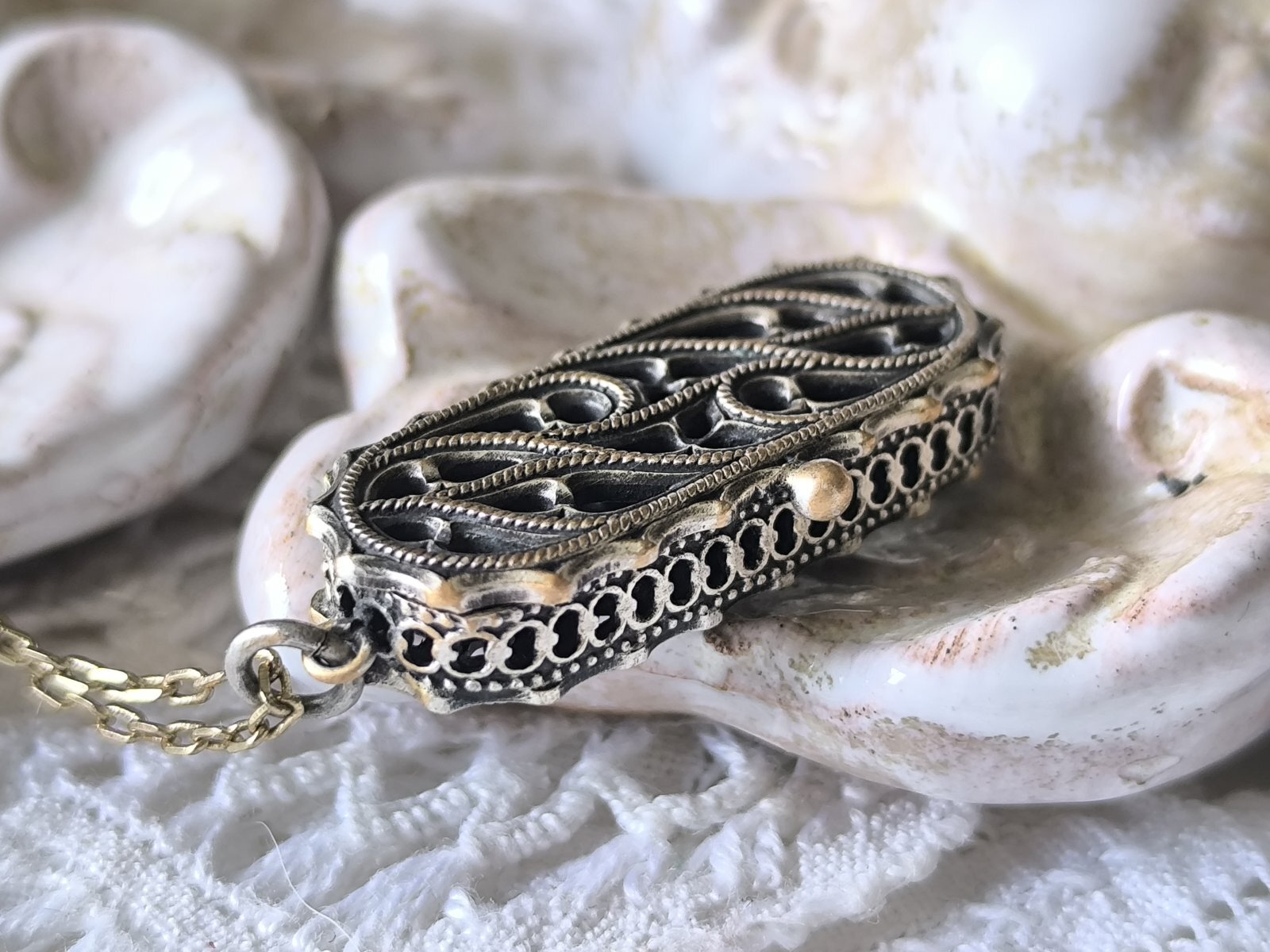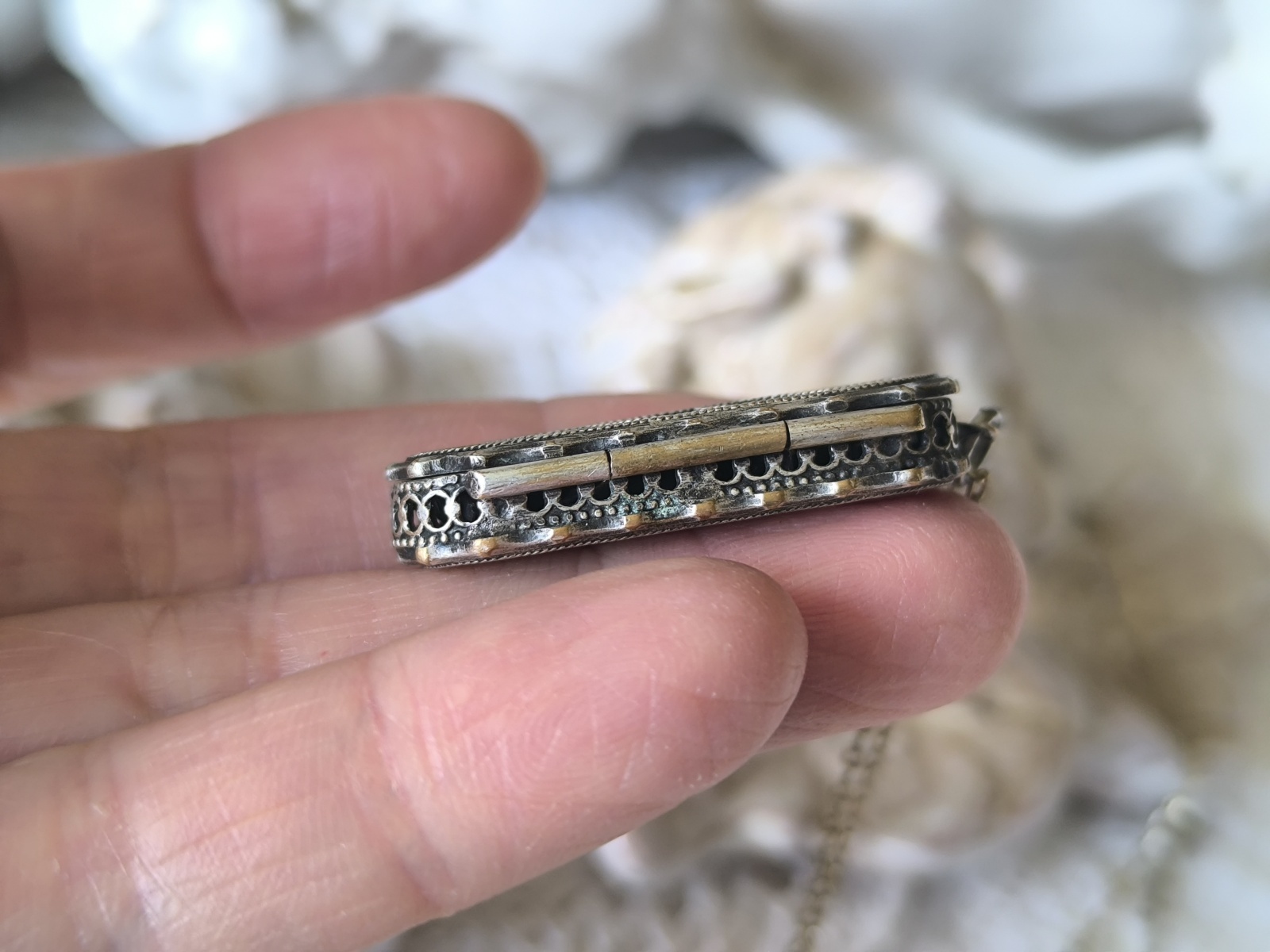 【図柄など解説】 19世紀末〜1900年代初頭のアンティークのミニルリケール風ロケットペンダントです。 土台はシルバー製、裏表それぞれ別のモチーフでどちらが表にきてもいい両面デザインになっています…