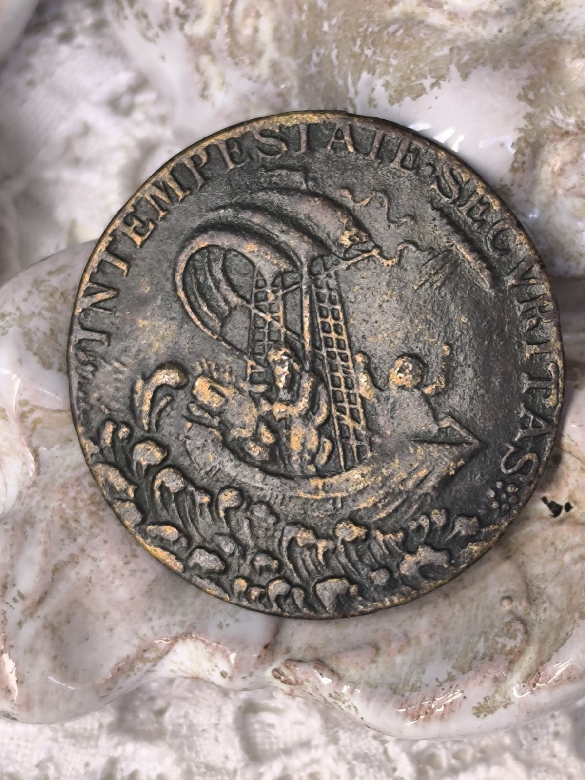 裏面の場面(イエス嵐を鎮める)にかけて今度は船乗りたちのお守り、航海の無事を祈るお守りとしても人気のメダイとなりました。