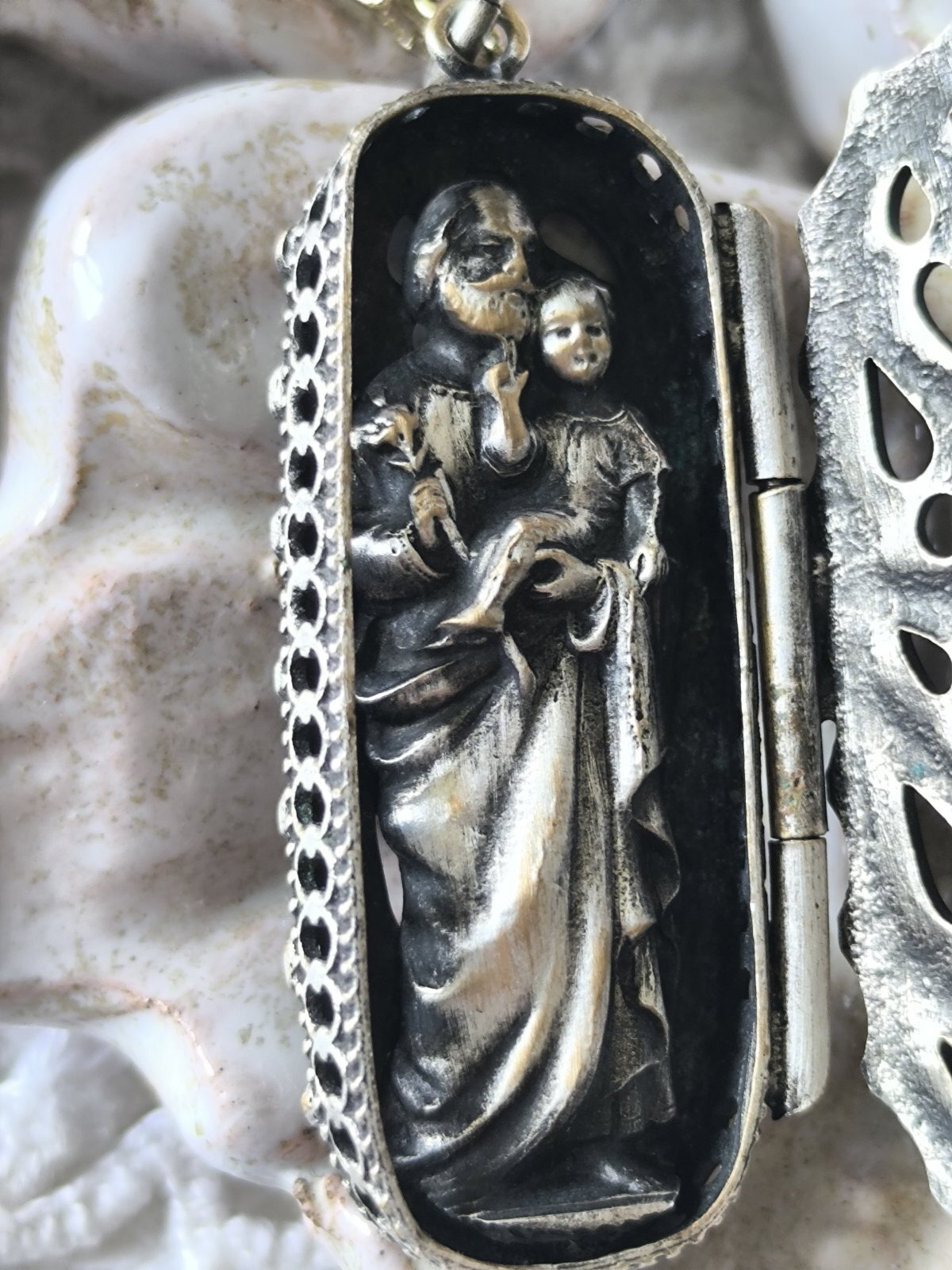 ケースも聖像も真鍮製で表面にシルバーメッキが施されており、シルバー独特の黒ずみ(硫化)でいい塩梅に暗色になっています。
