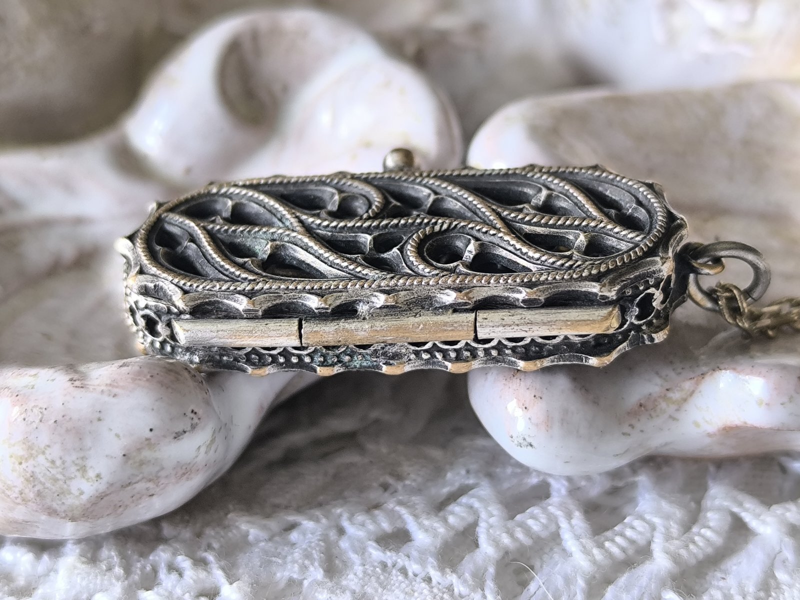 【19世紀末】【本物の胡桃の殻のロザリオケース】【総シルバーパーツのディゼンヌ(一連ロザリオ)とセット】フランス・アンティーク&ヴィンテージ品